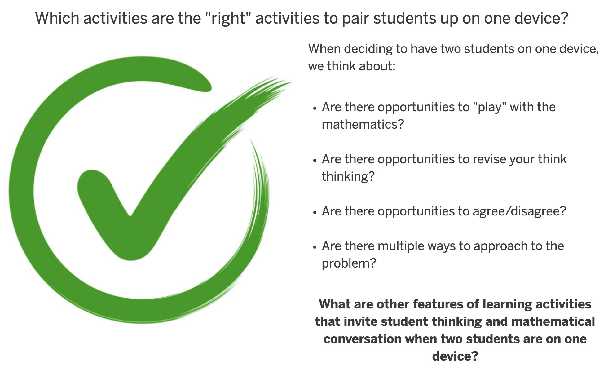 So then the question is, when to do it? If students are doing practice problems on DeltaMath, that doesn’t need to be paired. This is the slide the presenters had for this: