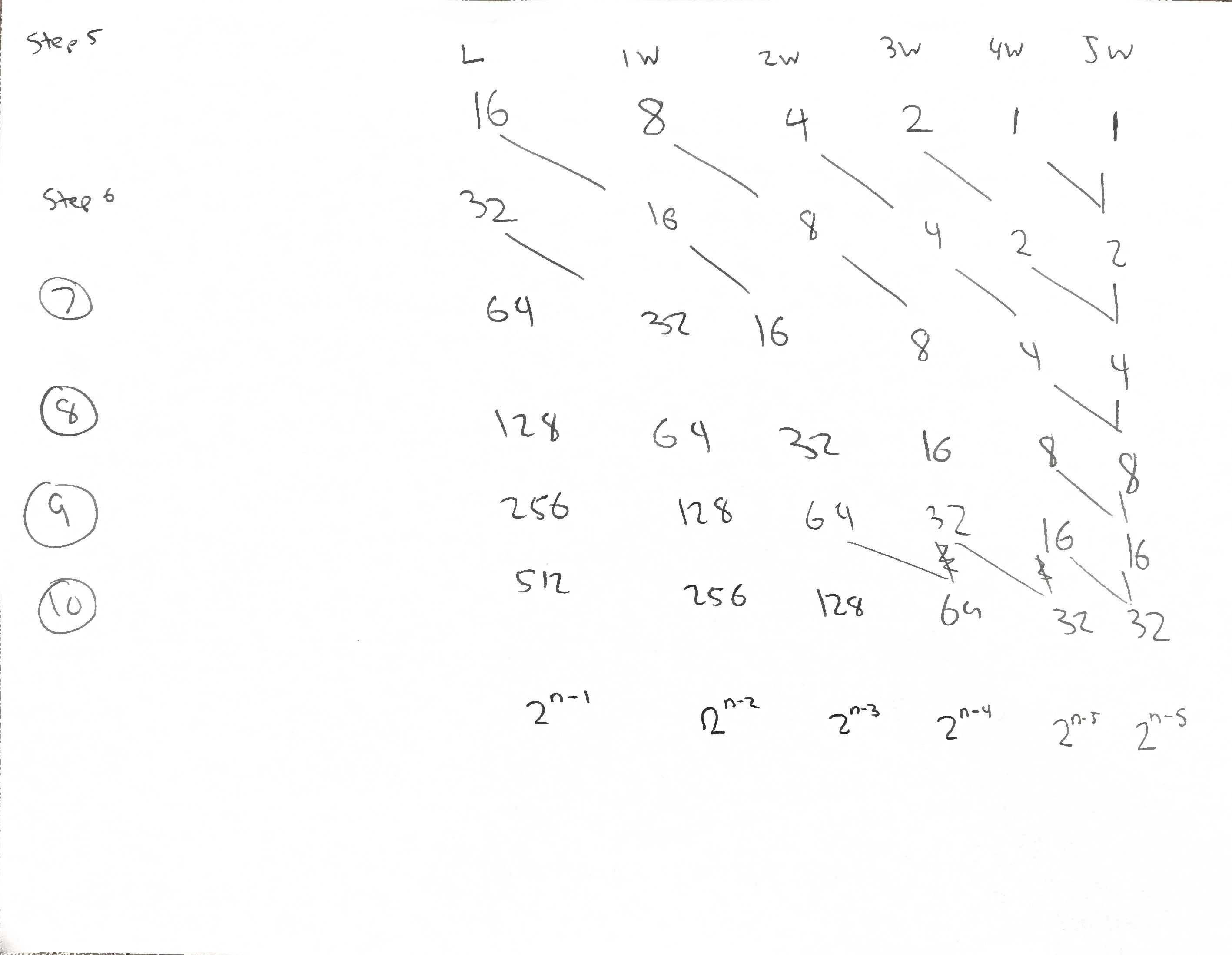 What really matters as you go through each game in the run, once you get past 5 games, is just the final five games. As you go through each game, we’ll notice that there’s a doubling happening. For example, after 2 games there’s 1 way to end in 2 wins, 1 way to end in 1 win, and 2 ways to end in a loss. After 3 games, there’s 1 way to end in 3 wins, 1 way to end in 2 wins, 2 ways to end in 1 win, and 4 ways to end in a loss. Once you get past 5 games, you no longer need to be introducing new sequences to look for, so then they start combining, as below: