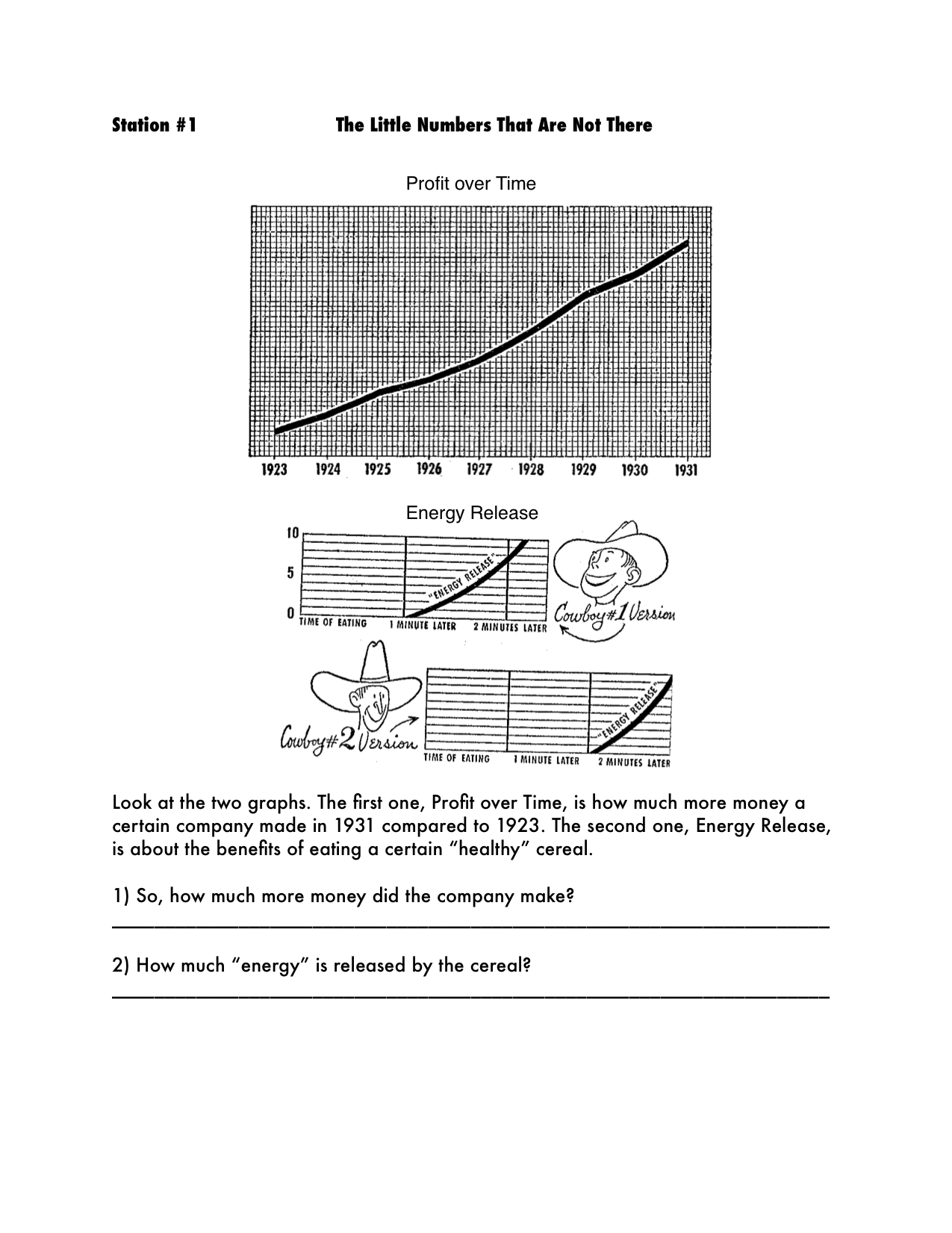 To compensate, I (along with my fabulous co-teacher) did a one-hour lesson that I broke up into stations, with each station representing a different “Lying Technique” that I wanted the students to learn about. (I had already covered The Sample with the Built-in Bias and The Well-Chosen Average as a normal lesson prior, because those are still relevant topics.) Each station lasted about 10 minutes, with some time for wrap-up and transit.