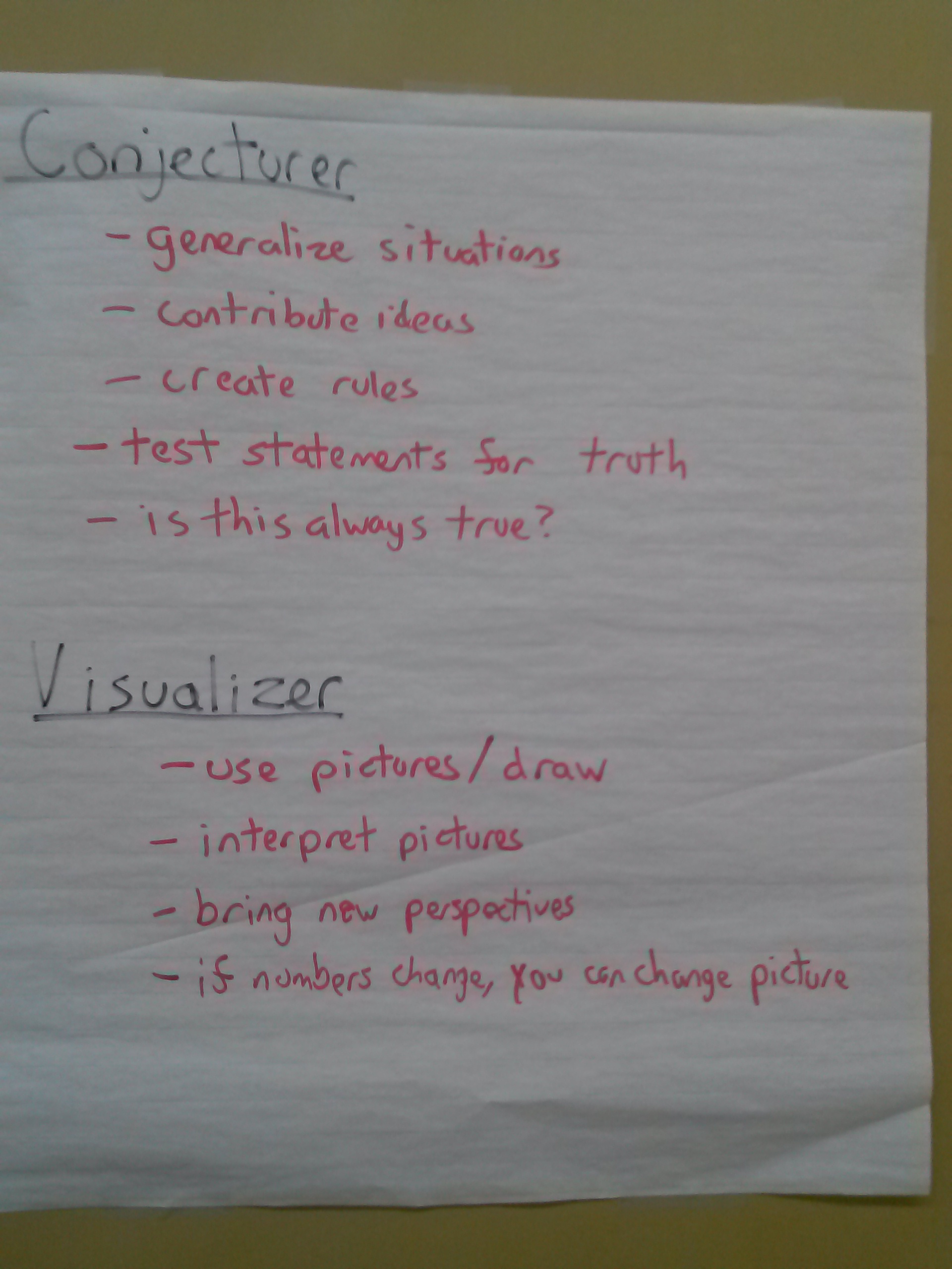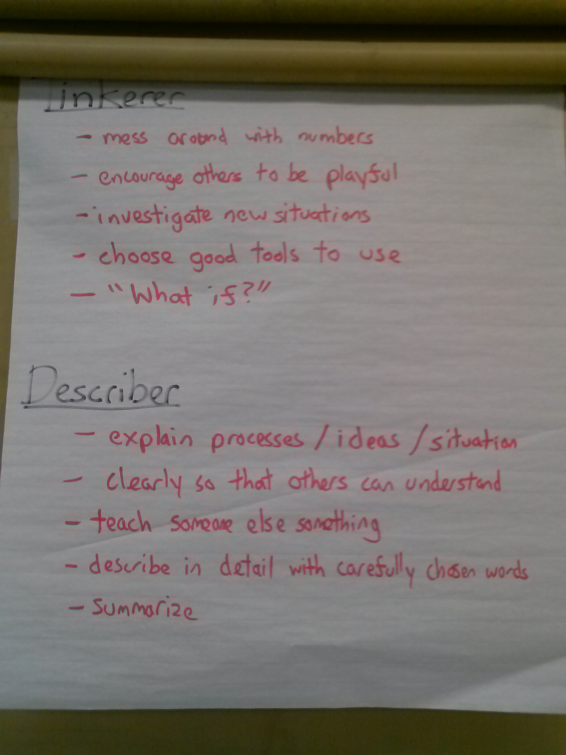 The first portfolios coming in have been graded and some of them were stellar and others need some work, but it was the first time and they are not really used to this whole reflective idea. But I have noticed that most of my students have started to use that vocabulary more and have become more aware of the kind of things that they are expected of them in the long-term, not just immediate math facts. I think if I start this from the beginning next year it’ll create a really great culture of thinking using the habits and the standards of practice.