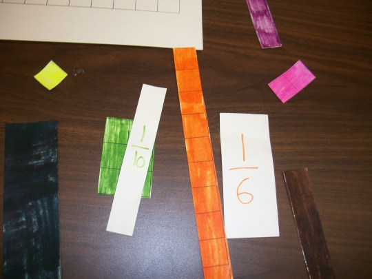 The Fraction Board has 60 square on it (which will be good reference for when I deal with sexagesimal Mesopotamian numbers soon), so each piece is cut to fit the amount of square that will cover that fraction of the board. To make the boards, I just made a 6×10 table in word as square-like as I could, printed on card stock. Then I cut the pieces out of the extra boards and had slave labor student volunteers color them in for me.