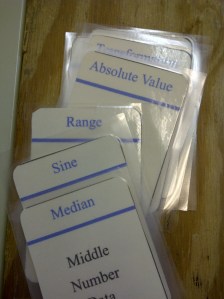My co-teacher and I went through all the Integrated Algebra regents given since 2008 and pulled out any words that it’s possible a student might not know. I also went through my own lessons and pulled out any vocabulary I had given them. Below is the .pdf for printing your own (I used card stock and laminated), and two .doc templates if you’d like to make more, or alter the ones I have. I made a total of 126 cards (63 double sides – maybe slightly overboard).